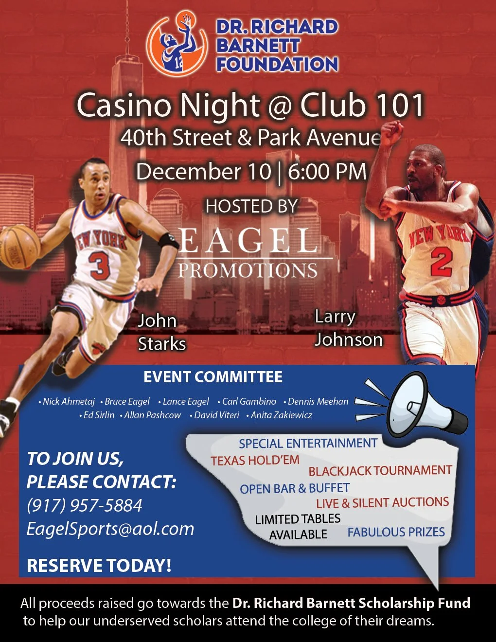 Hosted by our friends at Eagel Promotions, our casino night event will feature New York Knicks legends John Starks, Larry Johnson, and more! There will be a meet and greet with our special guests, a delicious buffet-style dinner, casino games, live entertainment, prizes, and so much more!